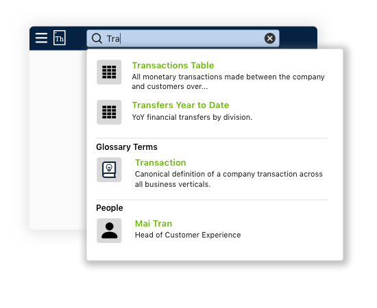 Persistent search is always available and works like you expect it to, whether you are searching for the right data asset, a data expert, or a person.
